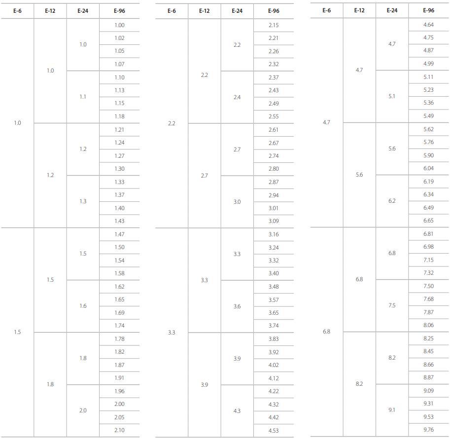 下表列出每種系列的厚聲電阻的標(biāo)準(zhǔn)阻值,表中的阻值是按照通用倍率得出的接近阻值。