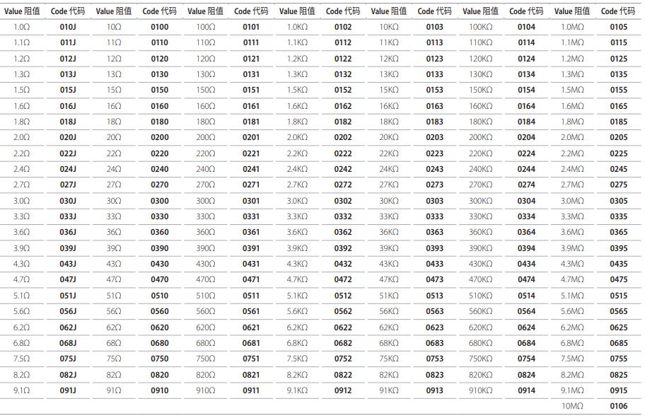E-24 系列標(biāo)準(zhǔn)厚聲電阻阻值和料號系統(tǒng)使用代碼 ( 4 位 , 以 0 為首位 , 2%、5%、10% 公差 )