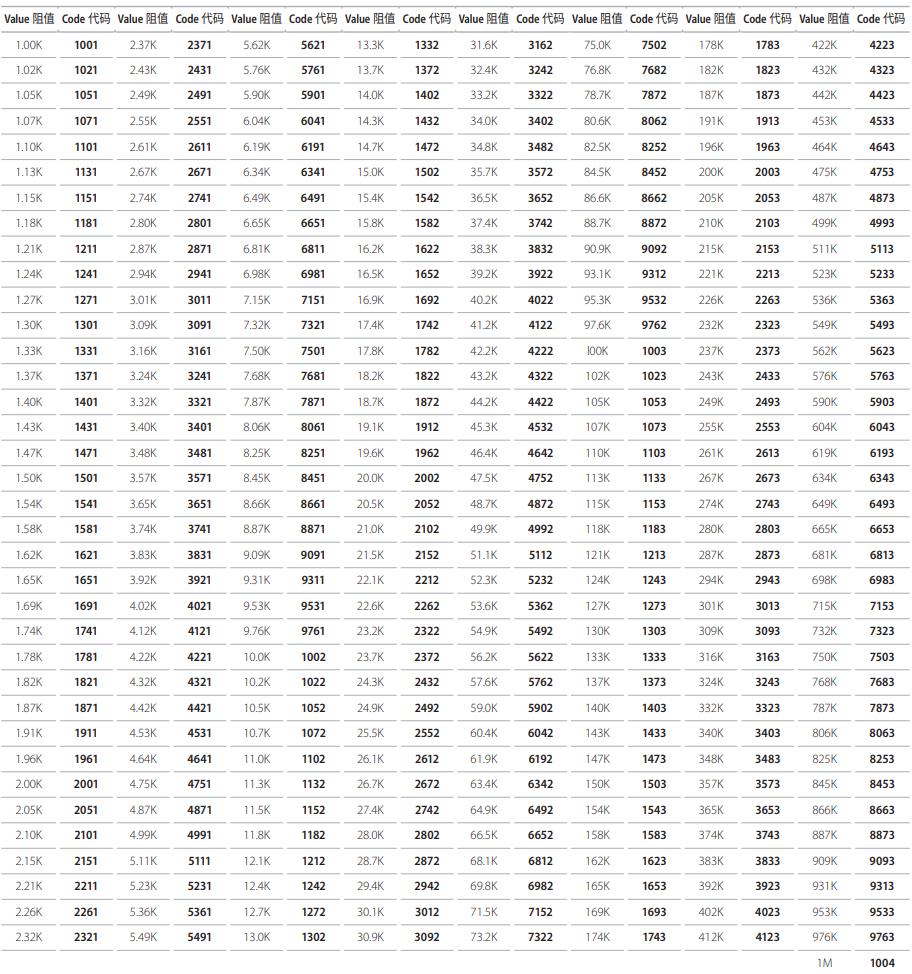 E-96系列標(biāo)準(zhǔn)厚聲電阻阻值和料號系統(tǒng)使用代碼((4 位 , 0.1%、0.25%、0.5%、1% 公差)