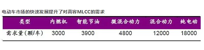 通信頻段大幅增加將帶來超小型MLCC的需求增量。相比目前滿足LTE標準的手機需要的300-500 顆貼片電容 ,到滿足LTE-advanced標準的手機需550-900顆,單機MLCC用量將提升80%以上。電動車市場的快速發(fā)展提升了對高容MLCC的需求。燃油車不需要使用MLCC,而純電動車需要使用大約18000個高容MLCC。