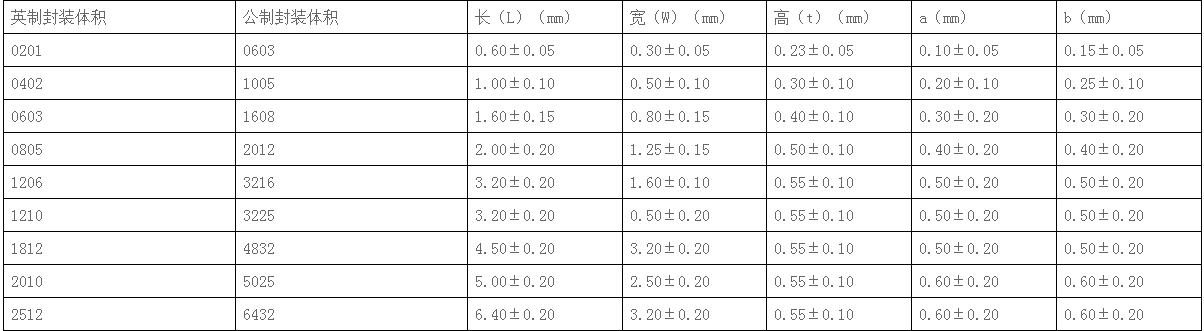 眾所周知貼片電感外形體積常見有九種封裝尺寸如0201、0402、0603、0805、1206、1210、1812、2010、2512等,不同的封裝尺寸它的額定功率也是不同的。而貼片電感型號大小一般用四位整數(shù)所表示,舉例:0805這型號電感,前兩位則表示電感長度,后兩位則表示電感寬度,不過根據(jù)長度單位的不同有兩種表示方法,一種為英制表示,另外一種則為公制表示。打比方英制表示法按0805這型號電感解析,英制長度為0.08英寸,而寬度為0.05英寸;公制表示法2012型號電感解析,公制長度為2.0;公制寬度為1.2(表示單位:mm)。一般行業(yè)的慣用叫法都是以英制為主。下面小編會列出常見九種封裝尺寸公制英制表格供大家參考學(xué)習(xí)。