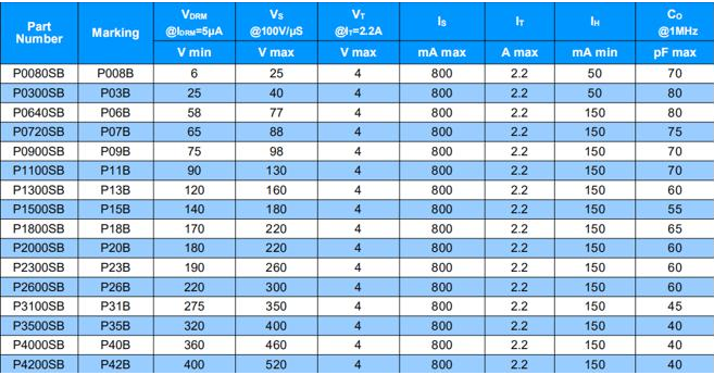 PXXX0SB系列TSS半導體放電氣管參數(shù)圖表如下